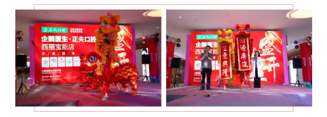 狮子点睛繁华富贵,簪花挂红生意兴隆,金狮开光威武赫赫,祥狮献瑞瑞气临门。企鹅医生·正夫口腔董事长助理汪礼长先生、企鹅医生·正夫口腔西丽宝能城店门诊总监王玲女士为舞狮画上点睛之笔后,精彩绝伦的醒狮表演正式开始,并由企鹅医生·正夫口腔拓展副总杨春盛先生、企鹅医生·正夫口腔西丽宝能城店门诊总监王玲女士进行采青仪式,吸引了众多客户及路人观赏,现场十分热闹。