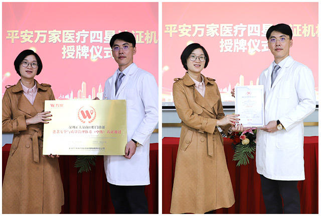 2019年3月7日,平安万家健康管理专家组一行人来到正夫口腔深南门诊部,向正夫口腔代表陈文龙院长颁发了《患者安全与质量管理体系认证通过》牌匾以及《医疗安全管理认证》证书,并授予门诊“万家认证四星诊所”称号。