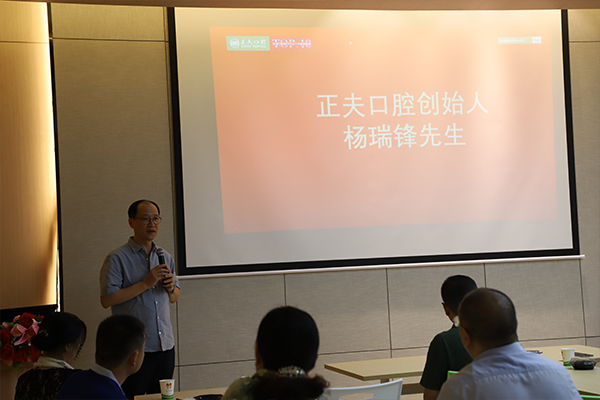 随后,在主持人的邀请下,深圳正夫口腔集团创始人、董事长杨瑞锋先生在本次交流会上表达了对现场企业代表的到来、蒋开儒先生的莅临表示热烈的欢迎并发表致辞。