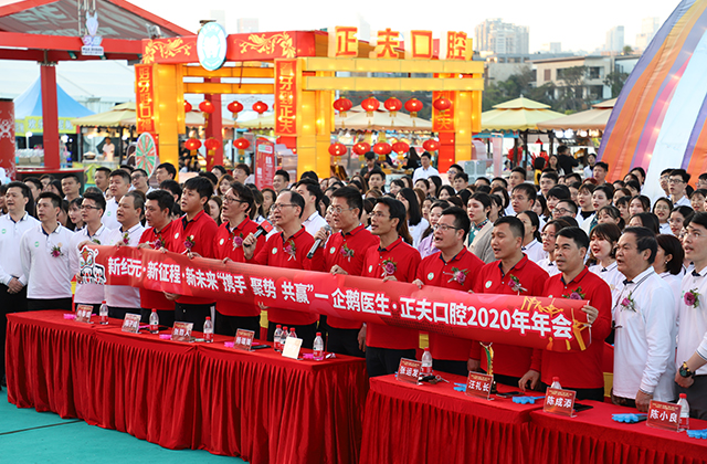 企鹅医生正夫口腔集团董事长杨瑞锋先生、总院长严宁先生、副总经理陈子成先生、执行副总张哲人先生、医疗副总张运发先生、董事长助理汪礼长先生等公司高层领导、口腔行业权威口腔专家、合作伙伴代表和正夫口腔所有员工共计500多余人共聚一堂、共叙情谊、共话发展,回顾2019,展望2020。