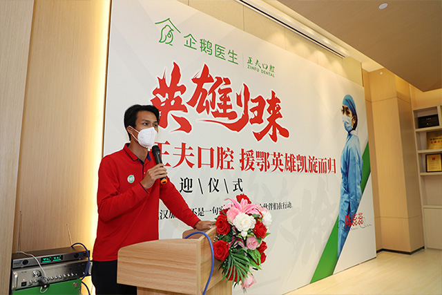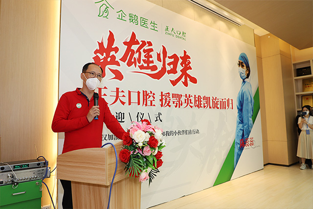 正夫口腔医疗副总张运发上台讲话,欢迎白衣战士平安凯旋并致以崇高的敬意和祝福。